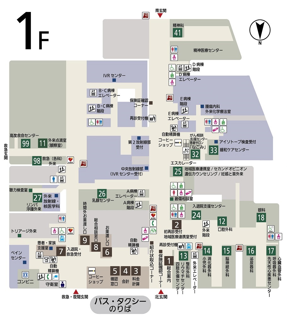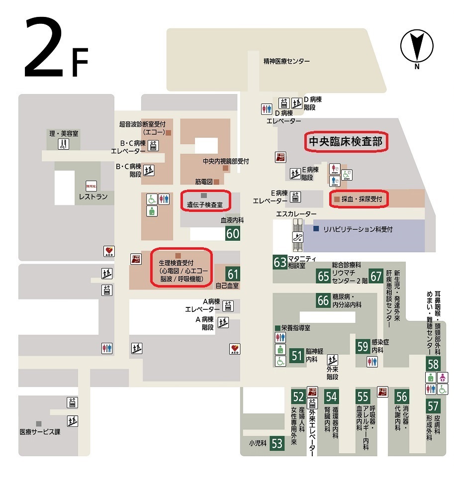 E病棟2階の中央臨床検査部総合受付・中央採血室(下図参照↓↓)にて採血を受けていただいたり、